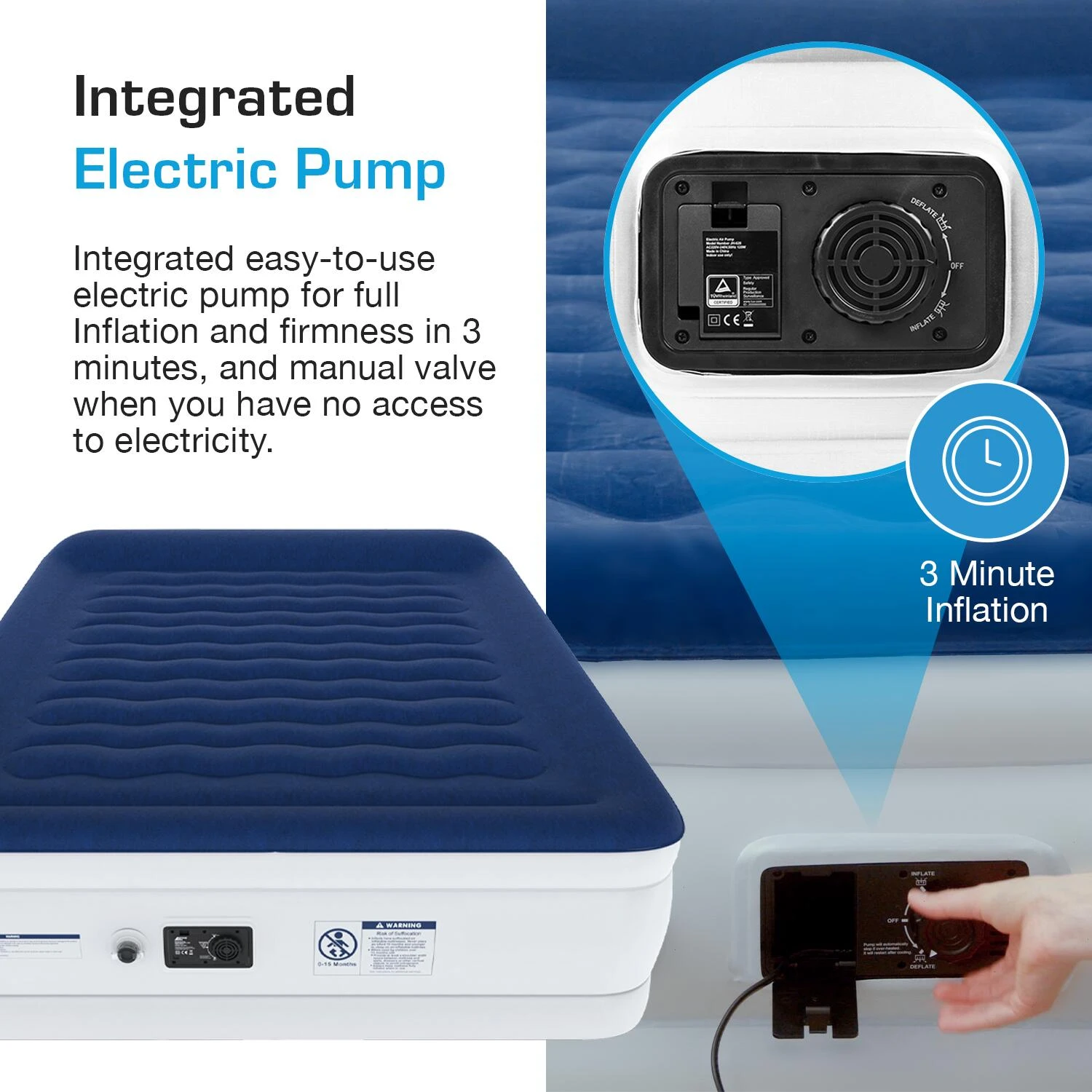 Built-in Electric Pump: Forget about having to manually inflate your air bed – just plug it in and it will quickly inflate itself in less than 3 minutes.