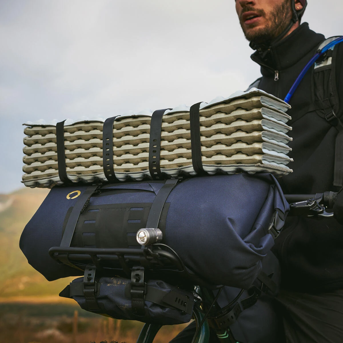 Great for holding bulky gear, the handlebar bag design includes an extensive M.O.L.L.E system for easily strapping other items like sleeping gear or tent to the outside of the bag. It can be used alone, but for better stability and access, it pairs perfectly with the front rack.