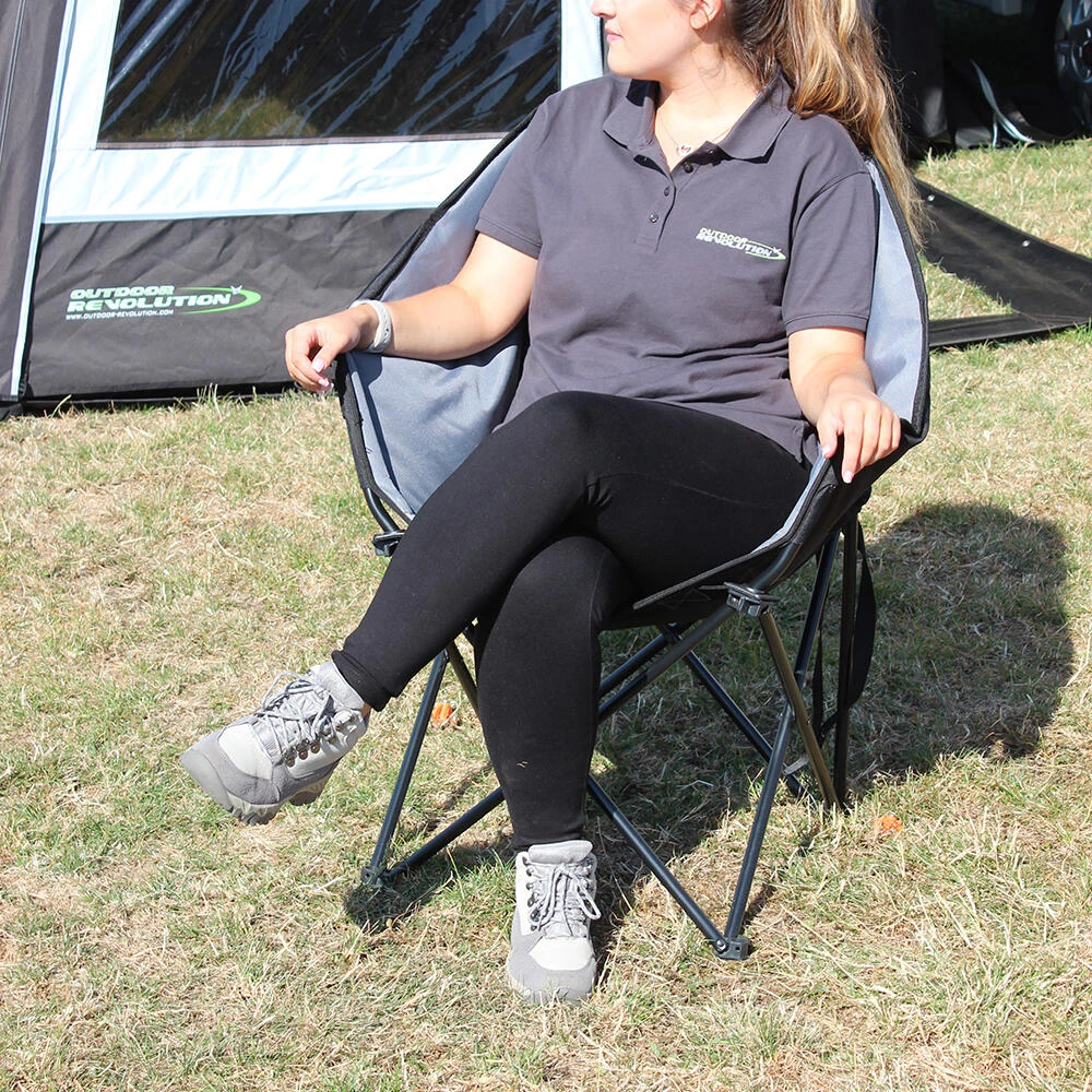 A compact folding camp chair with comfortable padded surround sides and supportive backrest. The padded fabric and sturdy steel frame provide exceptional comfort and support whilst the oversize wide base feet help to prevent the chair from sinking into soft ground and damaging ground sheets. Available in a choice of 3 complimenting colour variations. • Opens and folds in seconds